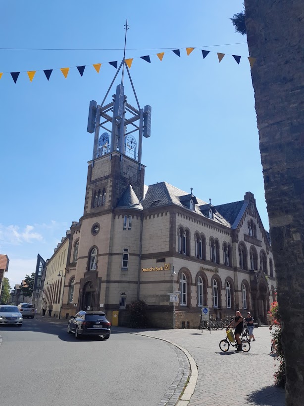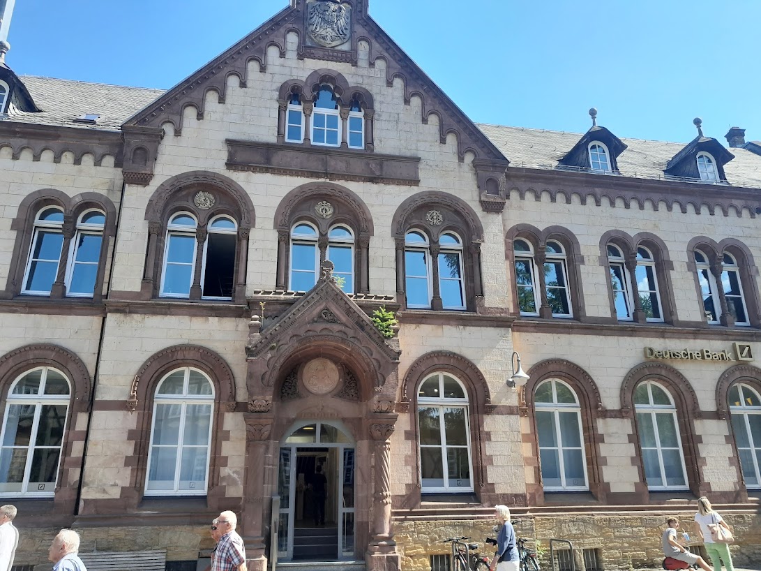 However, at some point we missed a connection, so the route was modified a bit. Luckily, there were trains going our general direction all the time. Some of the transfers were about 30 minutes, so I had just enough to quickly see small German towns and do Geocaches. On the way I saw a nice looking bank in the town of Goslar.